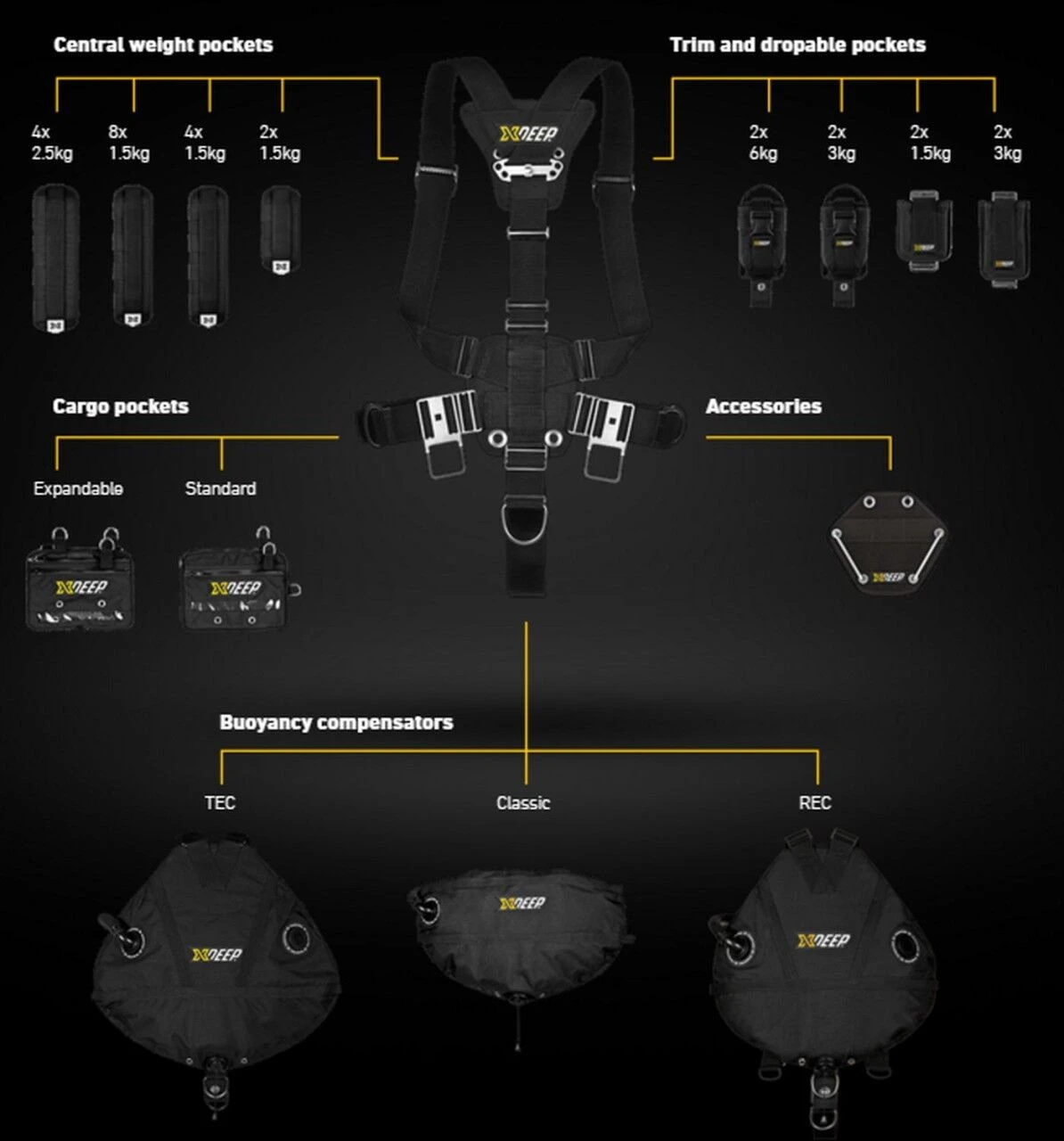 | Size | BCD only, RB BCD only (Redundant bladder), RB Set with Redundant Bladder & weight Pocket, D (8×1.5kg), RB Set with Redundant Bladder & weight Pocket, M (4×1.5kg), RB Set with Redundant Bladder & weight Pocket, S (2×1.5kg), RB Set with Redundant Bladder & weight Pocket, W (4×2.5kg), Set with weight Pocket, D (8×1.5kg), Set with weight Pocket, M (4×1.5kg), Set with weight Pocket, S (2×1.5kg), Set with weight Pocket, W (4×2.5kg) |